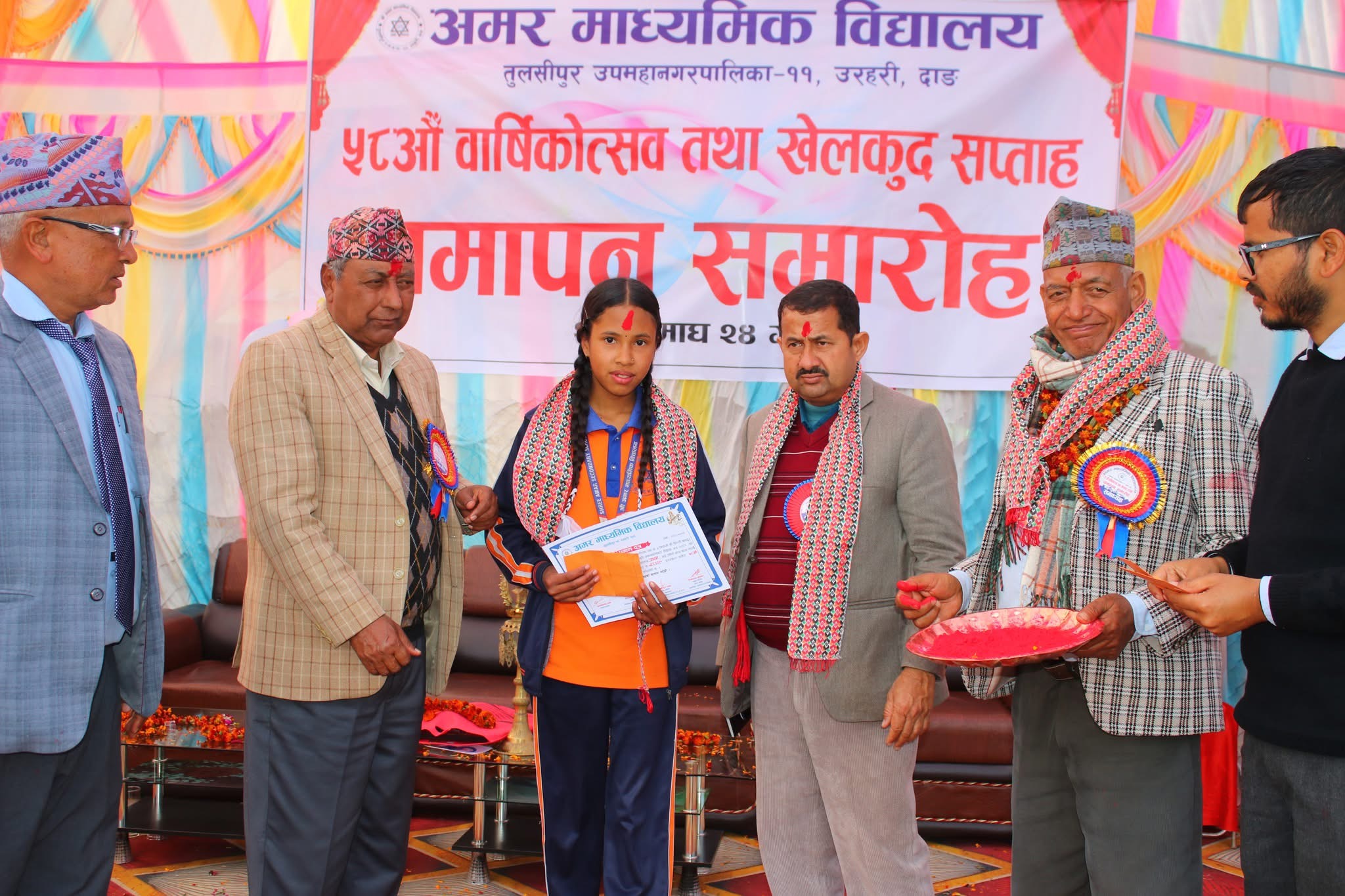 तुलसीपुर । तुलसीपुर ११ स्थित अमर माध्यमिक विद्यालय उरहरीले ५८औं बार्षिकोत्सव तथा खेलकुद सप्ताहको समापन गरेको छ । माघ २१ गते बार्षिक उत्सवका अवसरमा खेलकुद कार्यक्रम सुभारम्भ भएकोमा एक समारोहका… थप पढ्नुहोस
